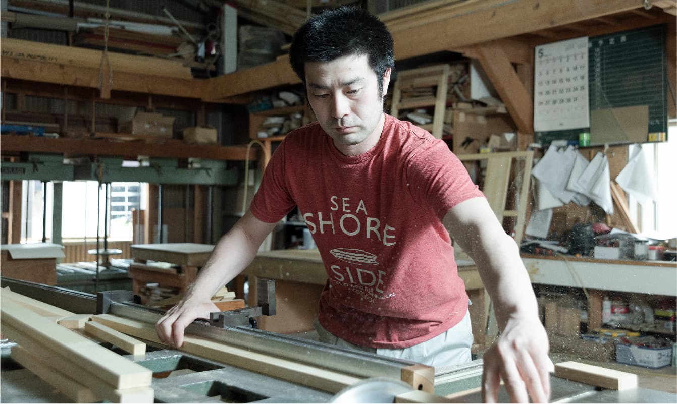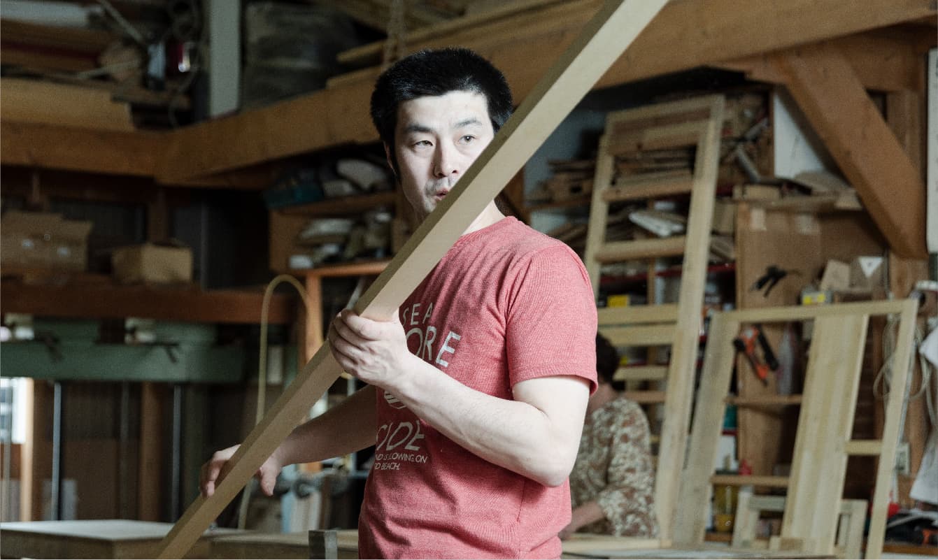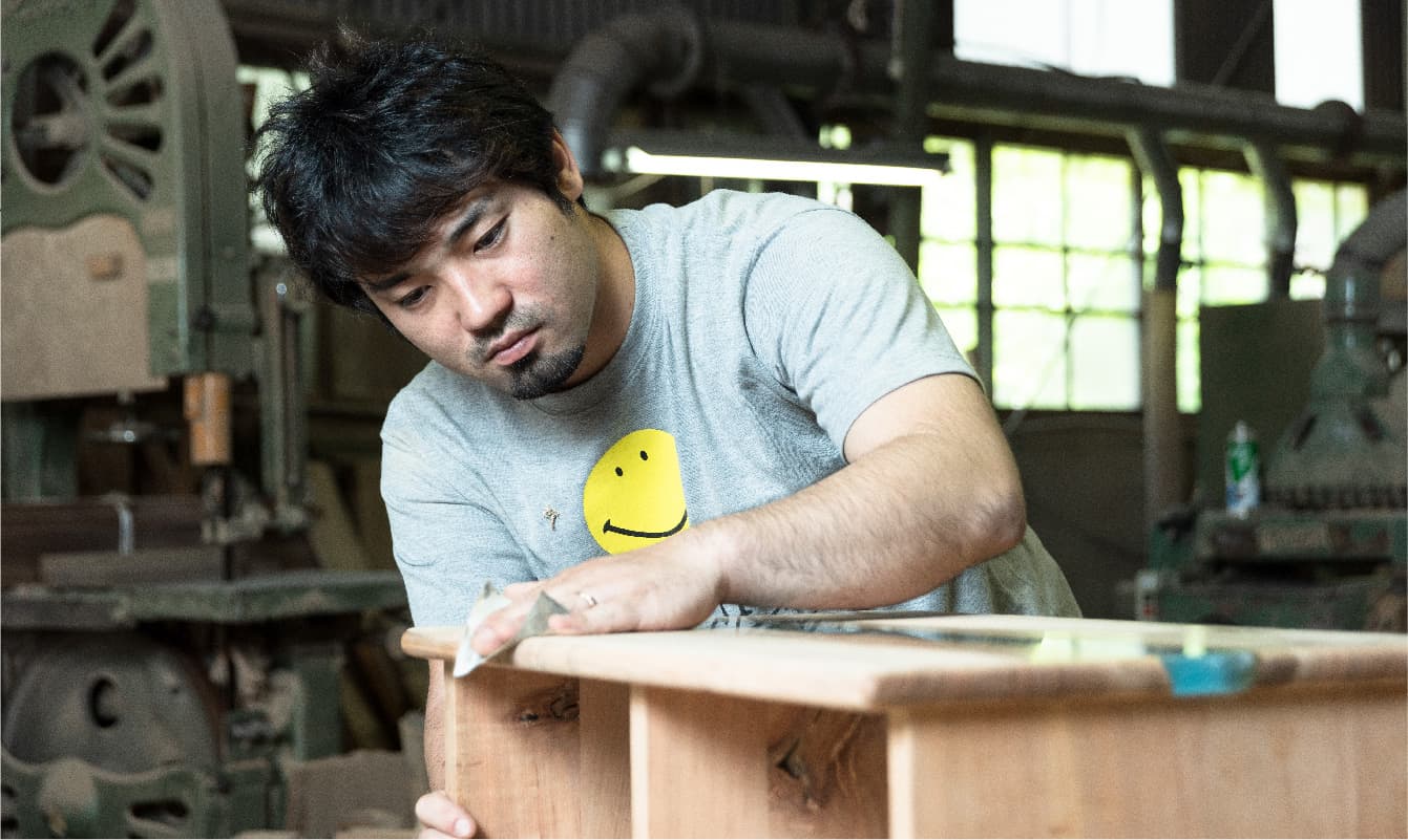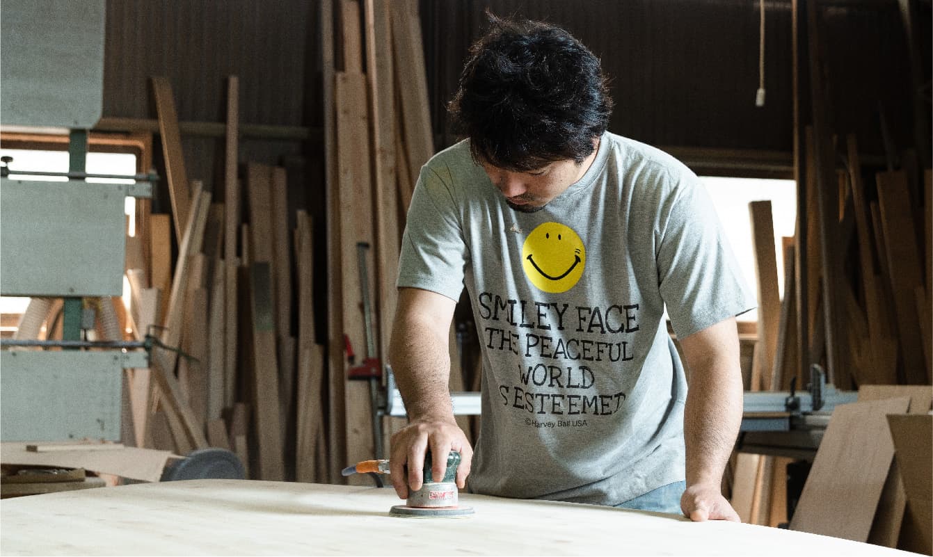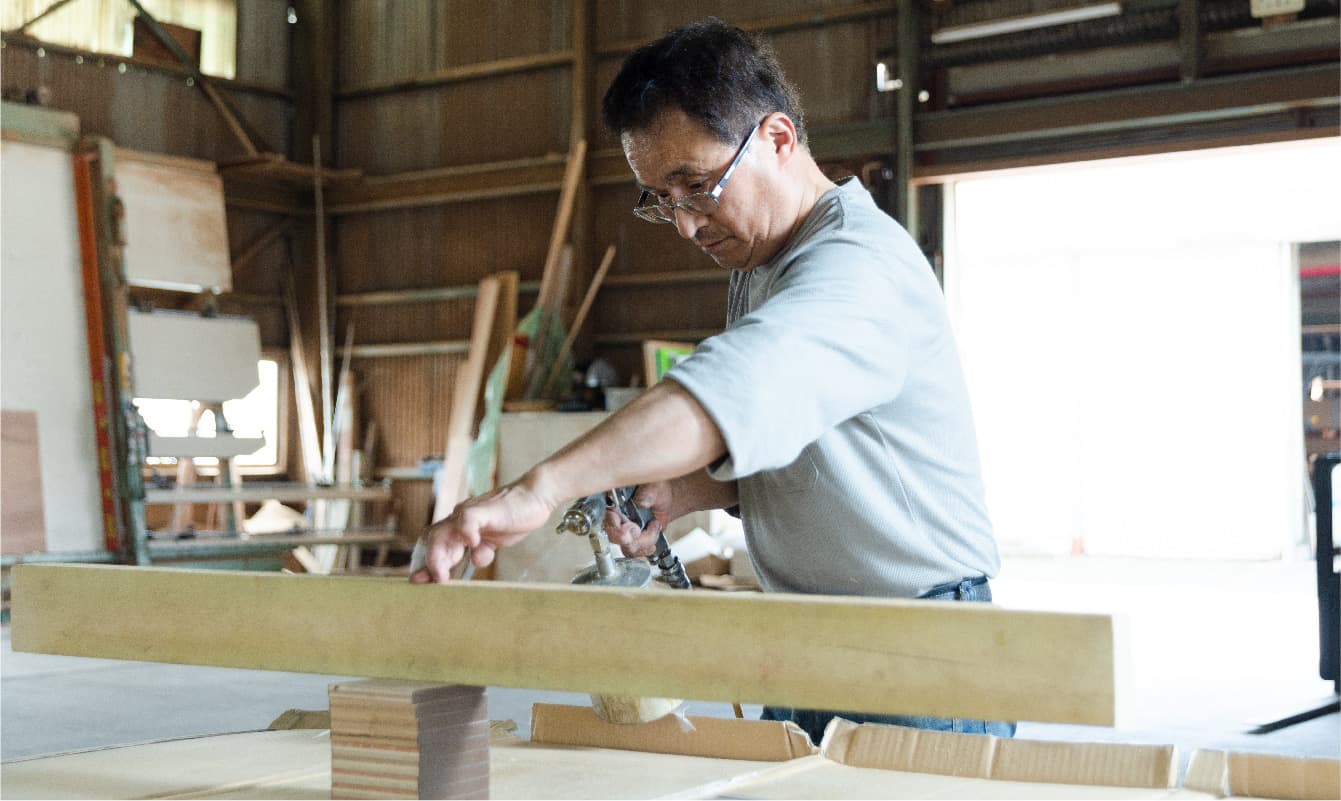親から子へ、木工職人の誇りと技術を受け継ぐ、明和木工。親子3人の阿吽の呼吸で、スピーディ且つ丁寧な家具が生まれていく。短納期対応も得意とする。