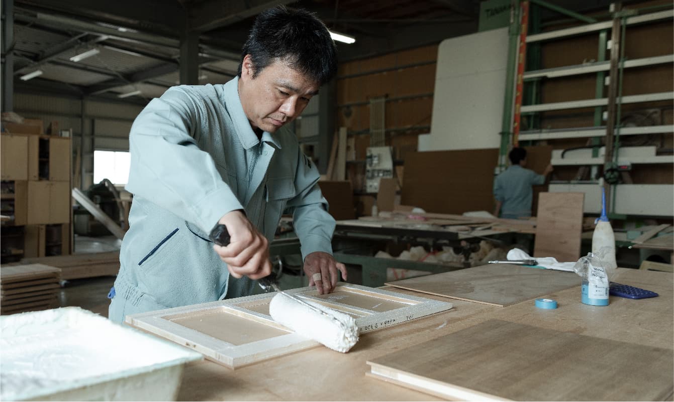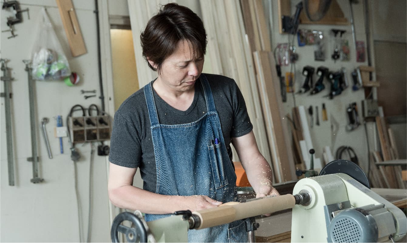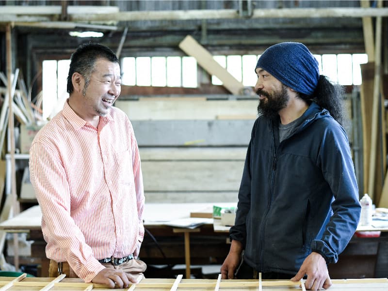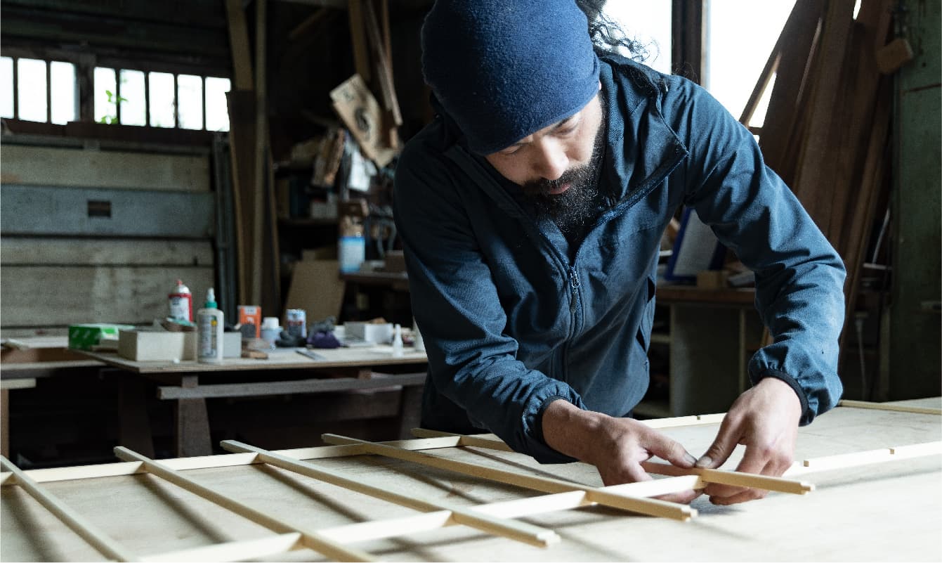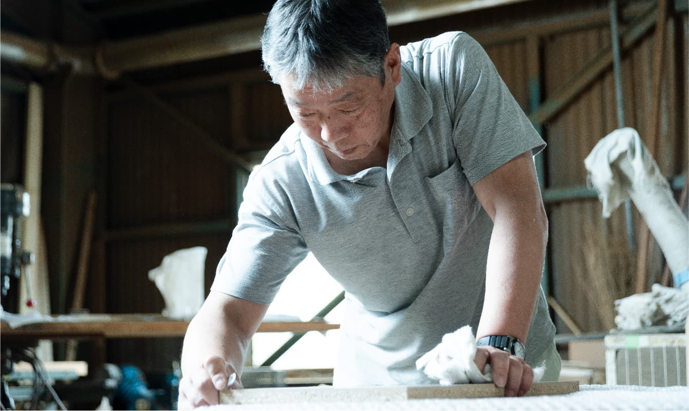 親から子へ、木工職人の誇りと技術を受け継ぐ、明和木工。親子3人の阿吽の呼吸で、スピーディ且つ丁寧な家具が生まれていく。短納期対応も得意とする。